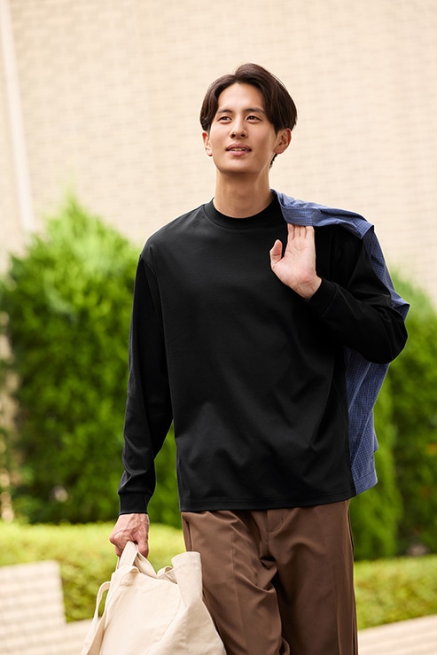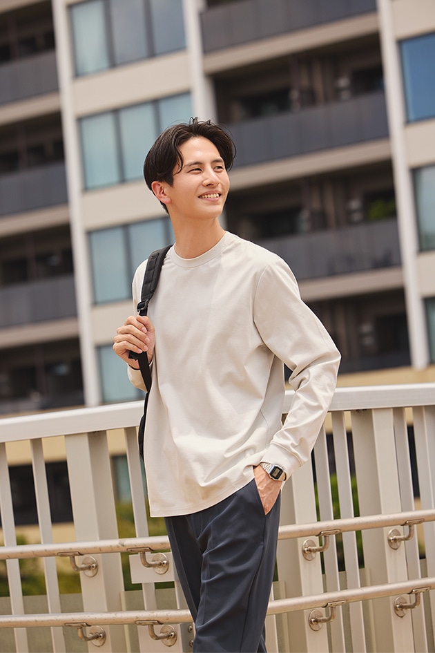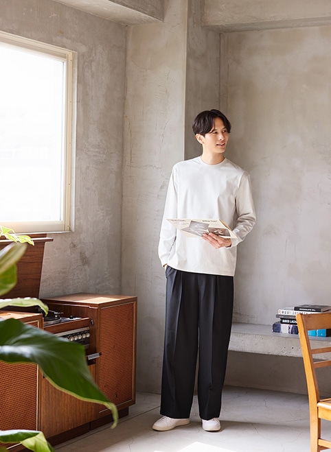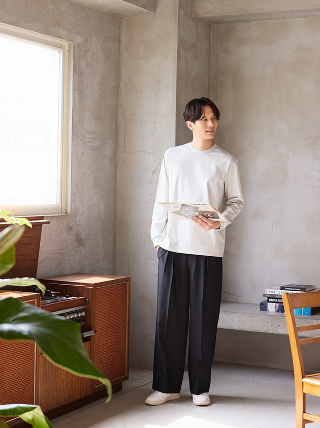ややゆったりとしたレギュラーフィット。 ミニマムなデザインは、アウター/インナーどちらも使いやすいシルエット