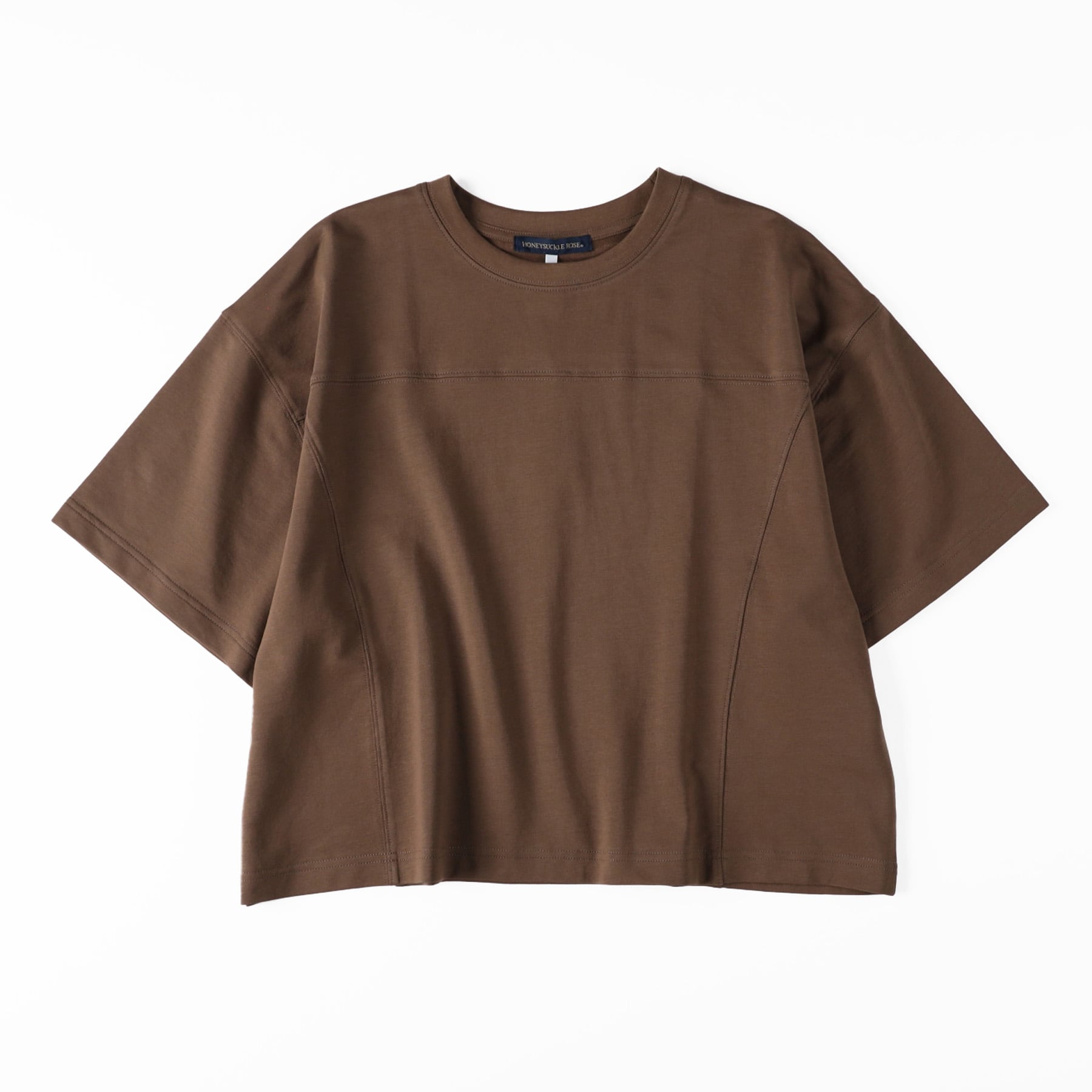 シンプルな無地Tシャツではなく、前身頃に切り替えのデザインを入れてベーシックに見えて少しだけアクセントを効かせたアイテム。
